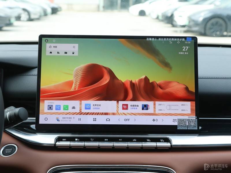 第5代帝豪采用了双屏设计,全液晶仪表和14.6英寸悬浮式中控大屏,搭载最新版Flyme Auto系统,云端、车机端、手机端三端无界融合,带来全场景、沉浸式的智能座舱体验,系统内置了非常丰富的功能,日常用车的各种场景都能应对。