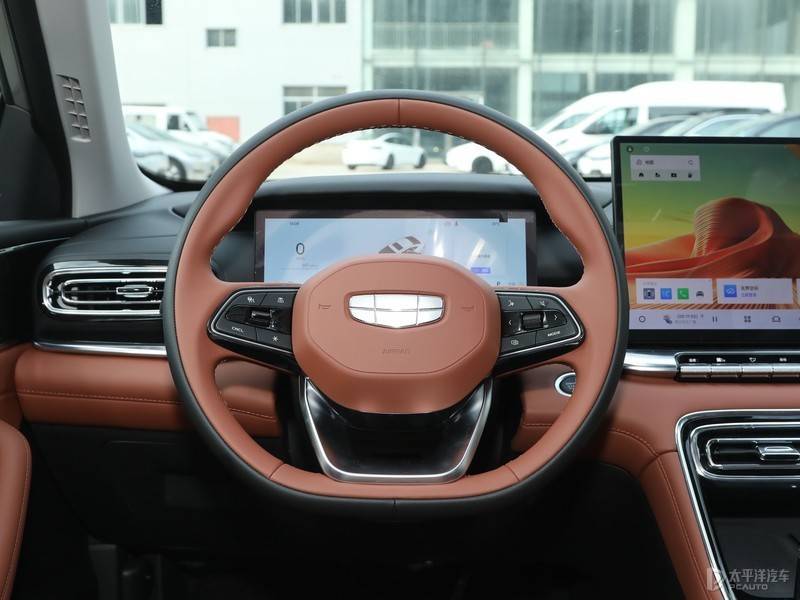 进入车内,第5代帝豪给人的视觉效果十分豪华,内饰用了不少钢琴烤漆面料装饰。新车有3种内饰颜色可以选,分别是旷野棕、云舒灰和星夜黑。